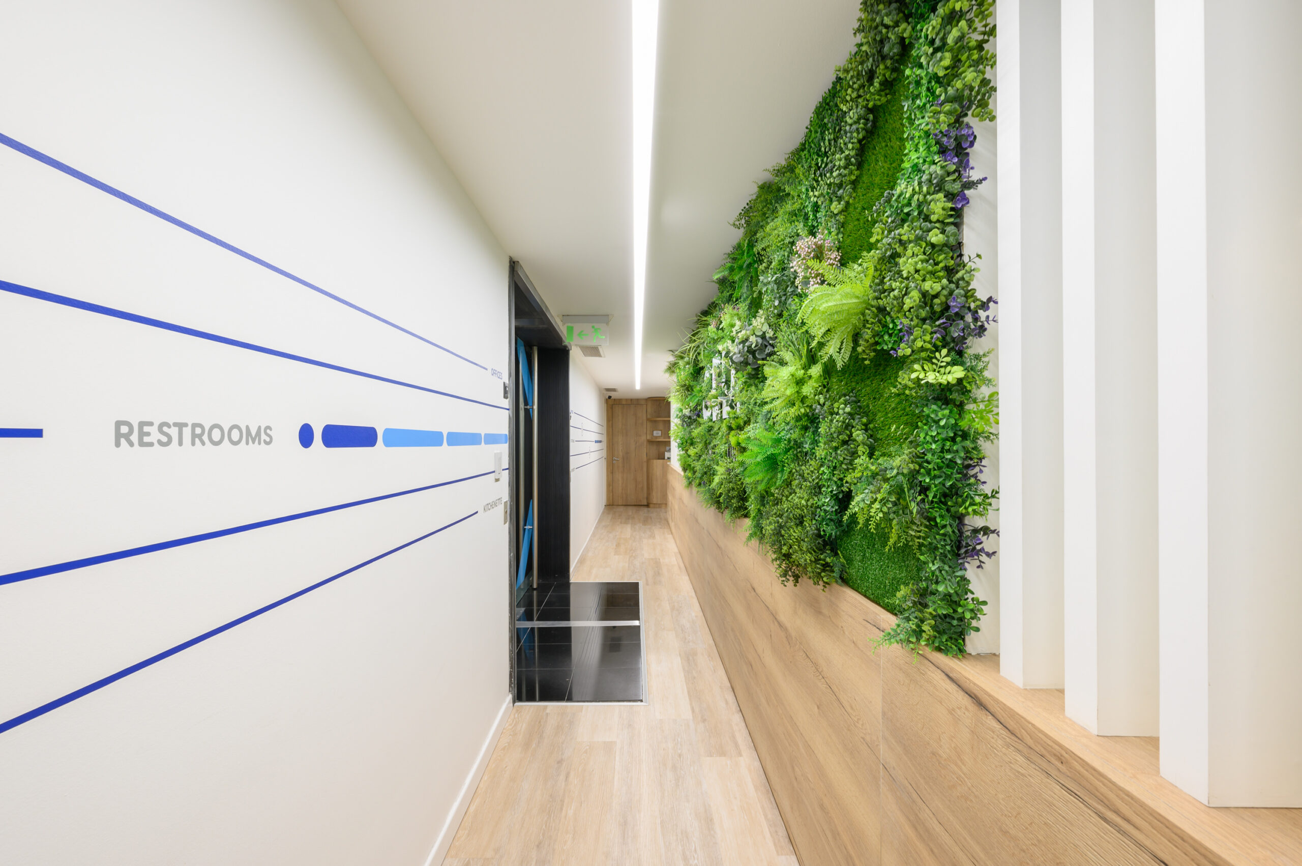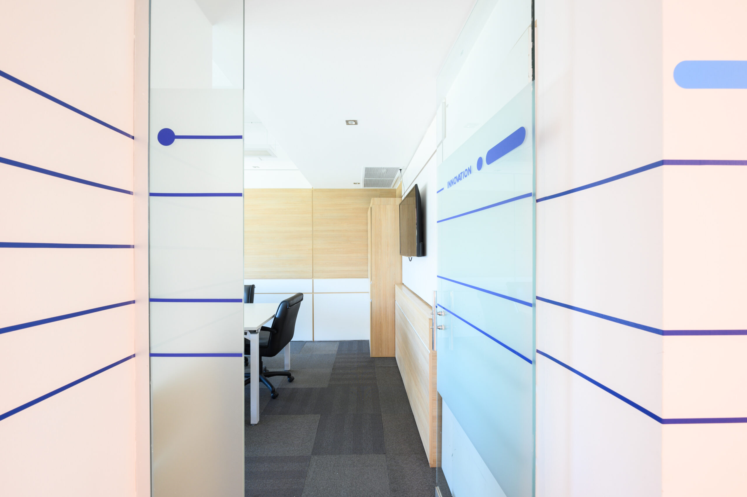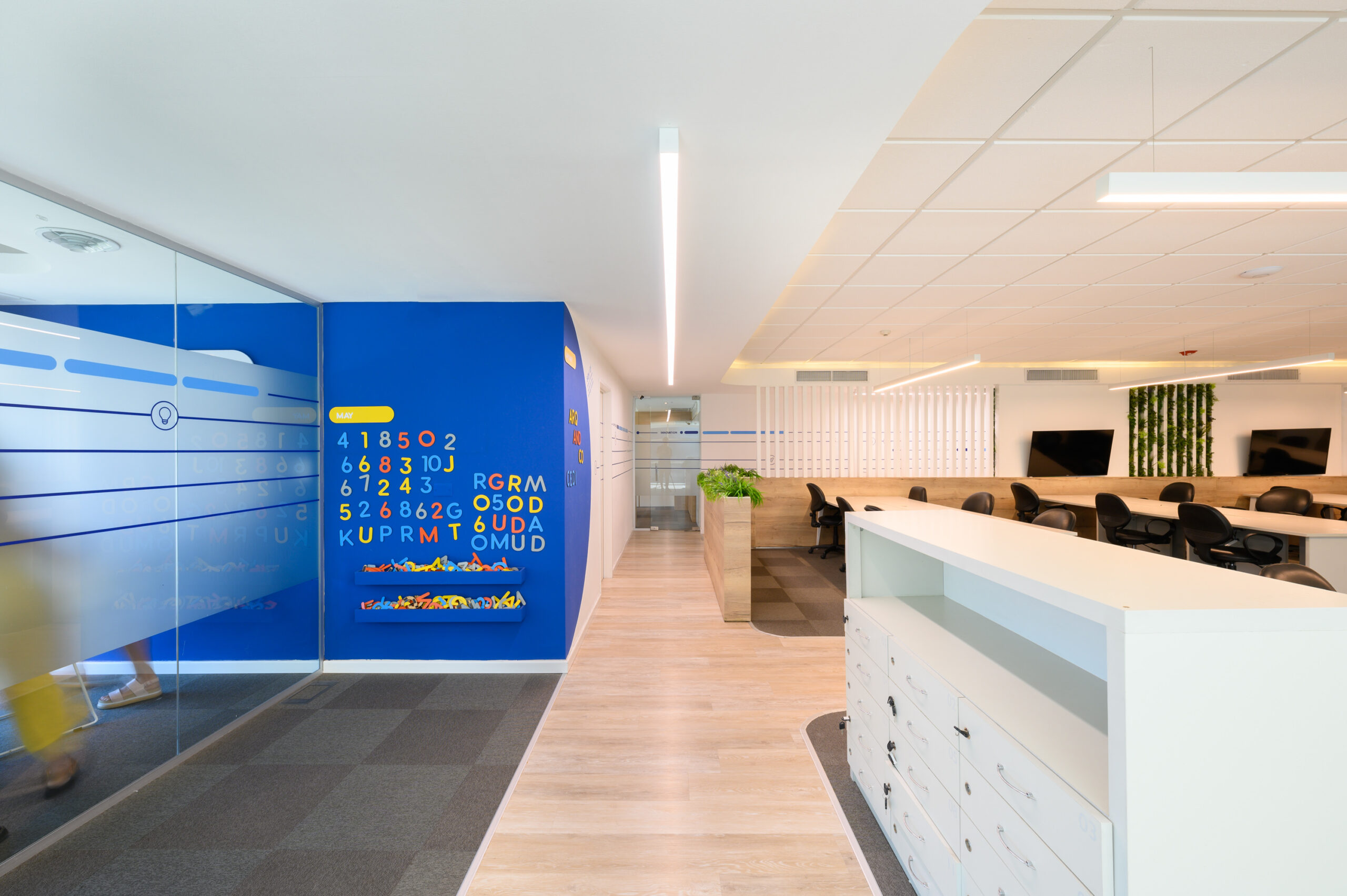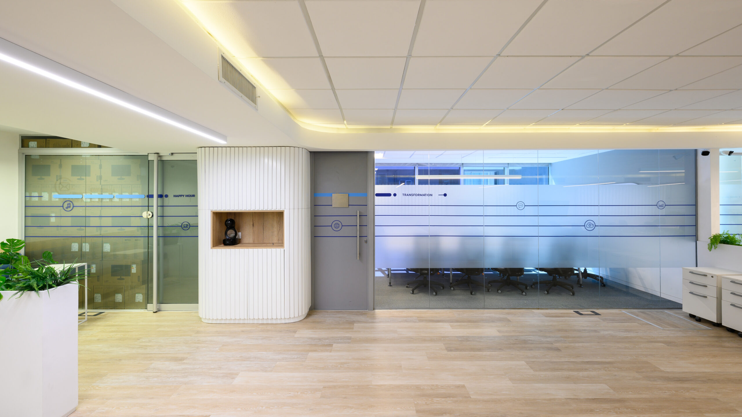 En el recorrido por los espacios comunes se propone un diseño infográfico que hace de guía por la estructura interna de la propia empresa a partir de los colores institucionales.