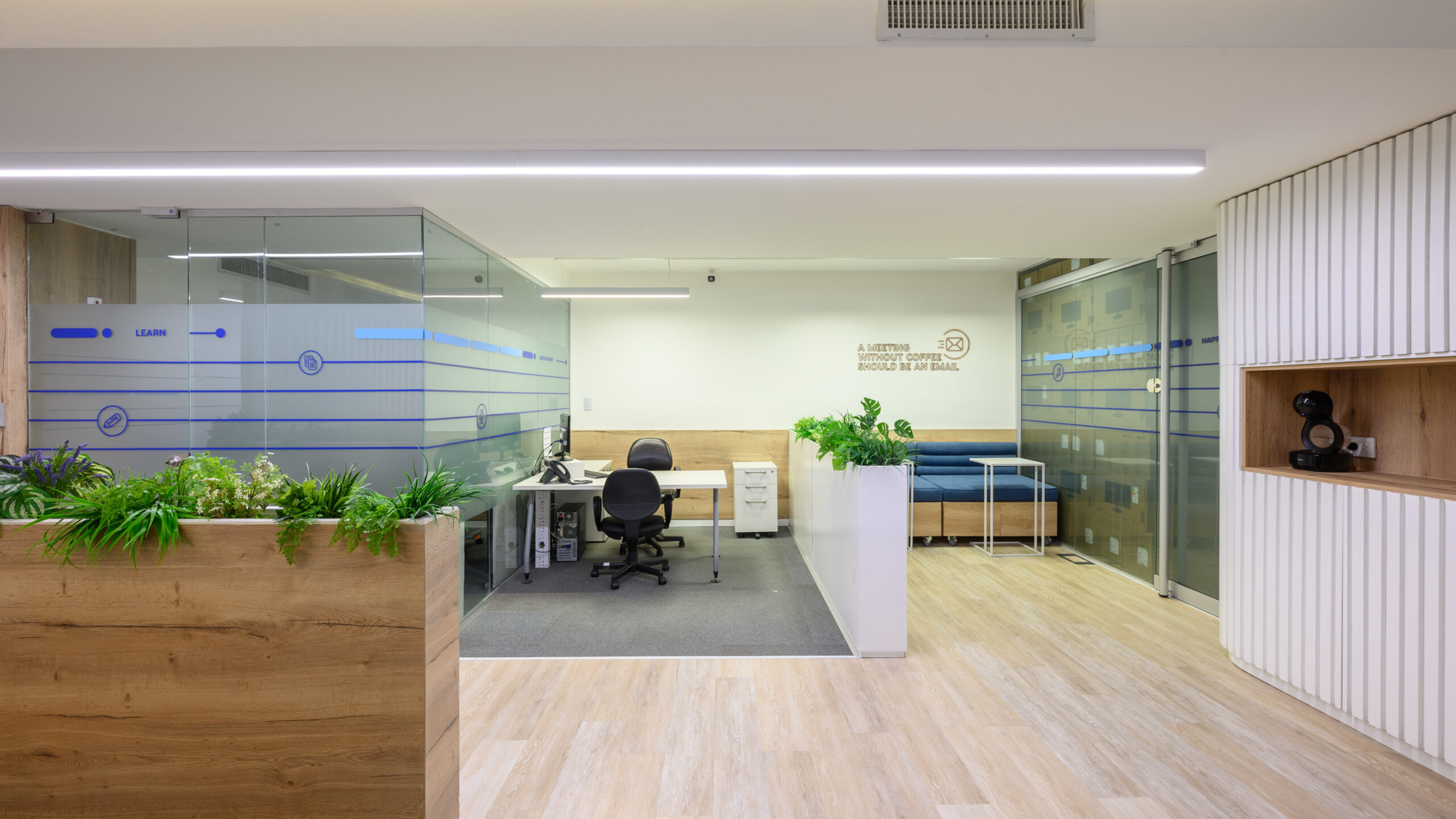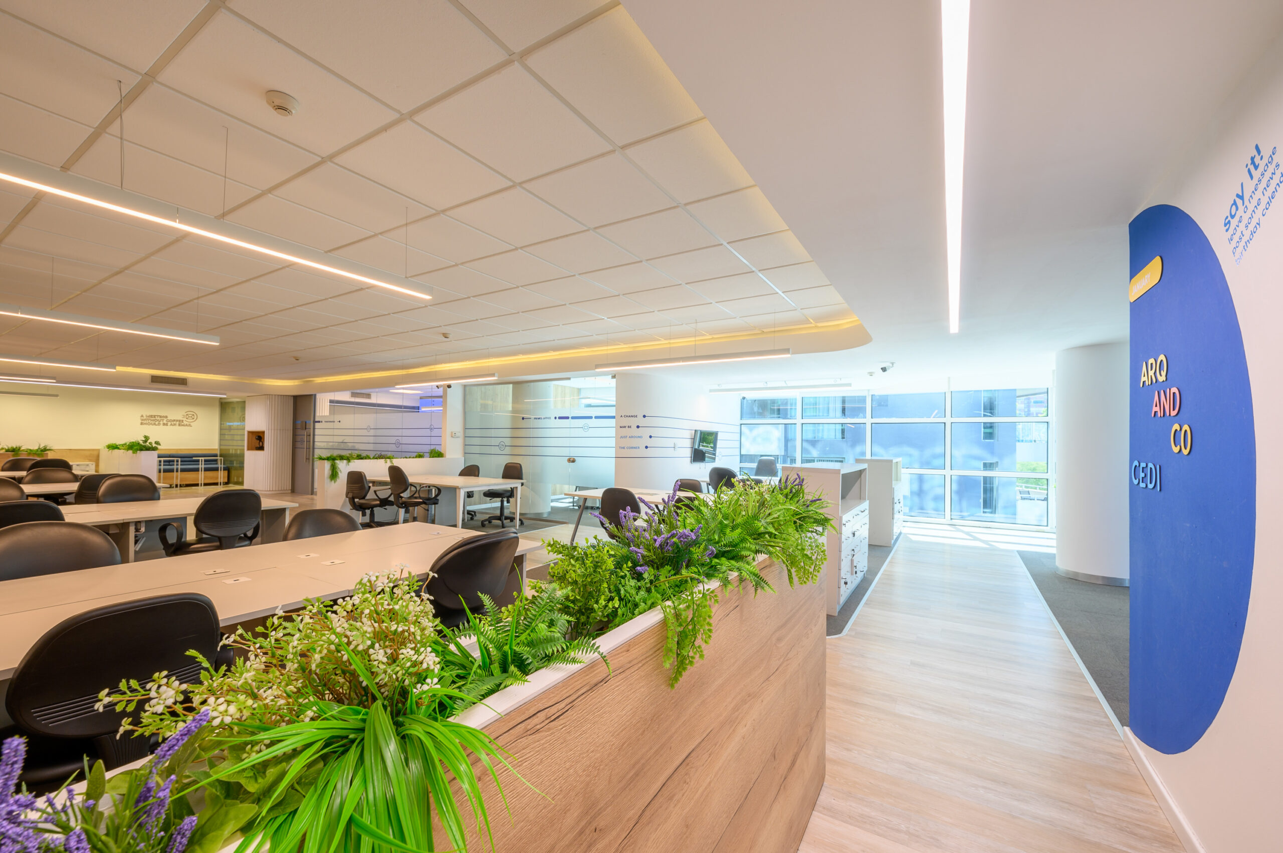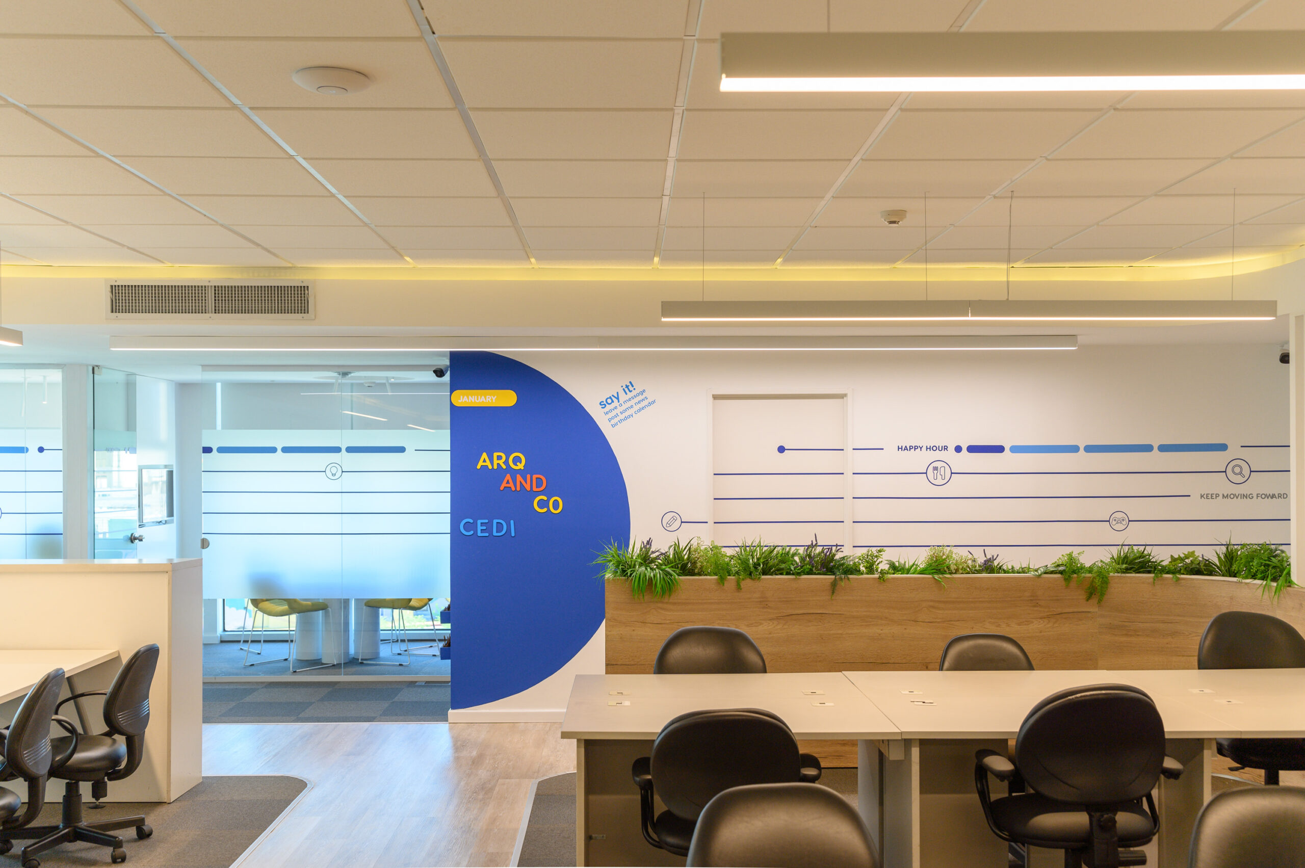 Proyecto corporativo para la empresa CEDI TECH CONSULTING. El desafío fue ampliar y unificar dos oficinas, creando un gran espacio de trabajo, incorporando elementos verdes, iluminación adecuada y espacios intermedios de relax y trabajo abierto. Se diseñaron, también, meeting points para calls privadas, salas de reuniones y el comedor de encuentro.
